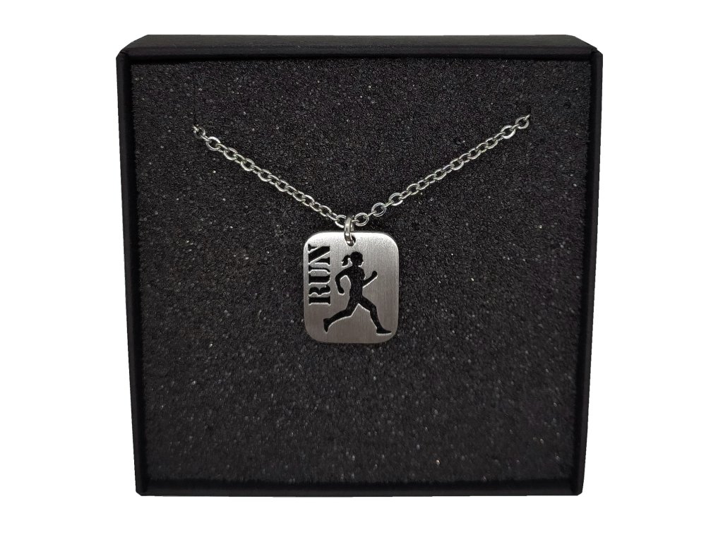 Přívěšek s řetízkem se siluetou běžkyně a heslem RUN.