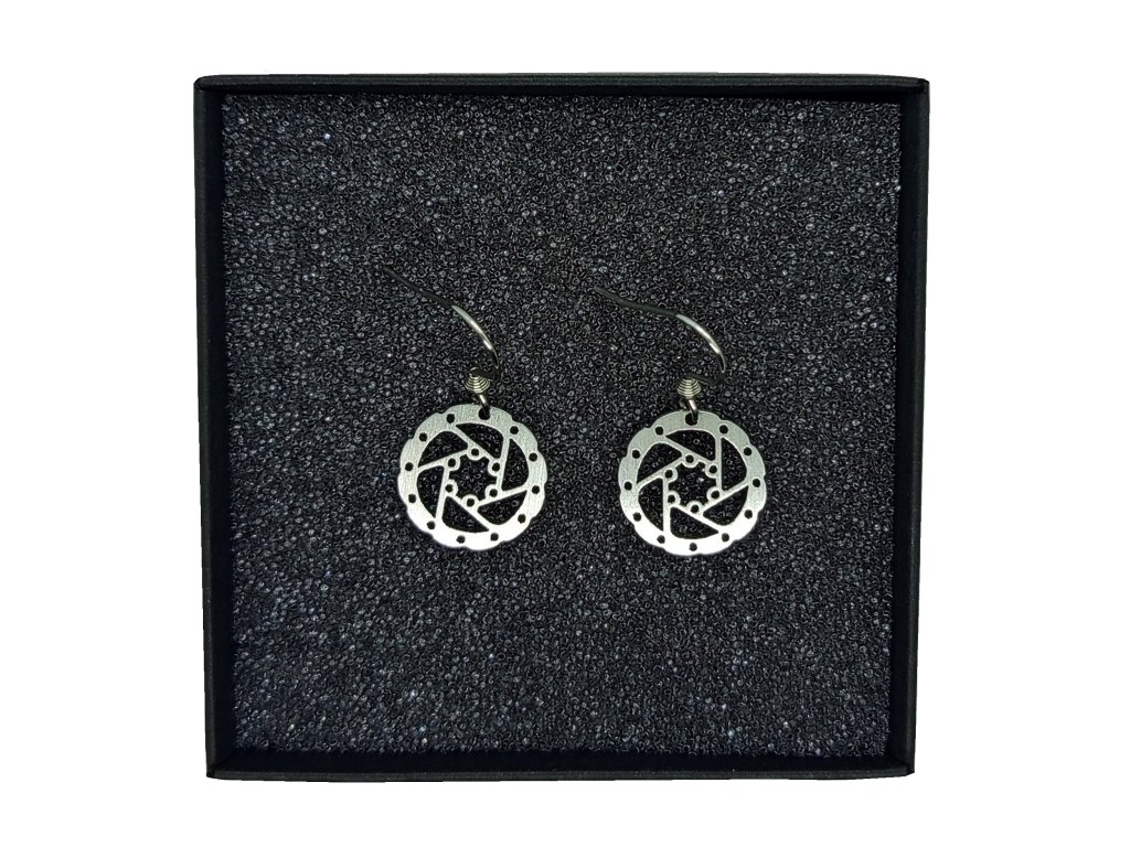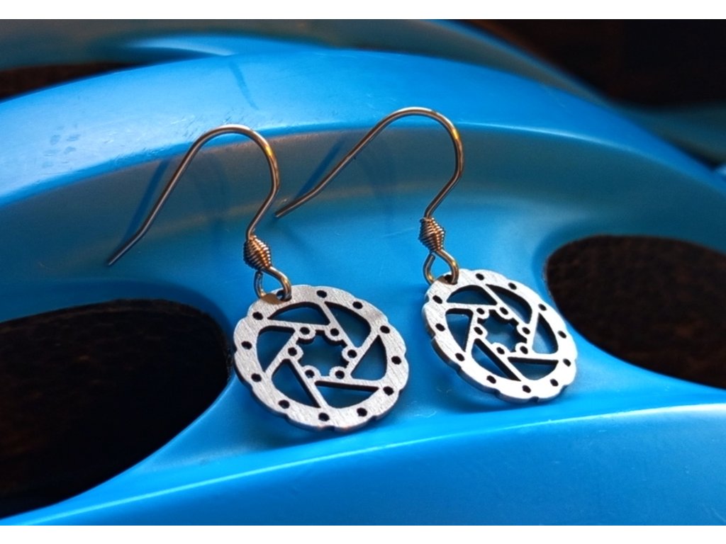 Náušnice pro cyklistky ve tvaru brzdového kotouče. Zavěšení na afroháček.