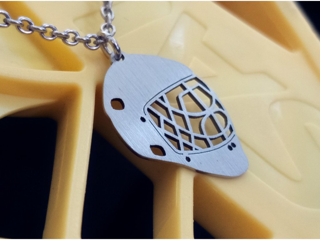 Přívěšek s řetízkem ve tvaru brankářské masky.