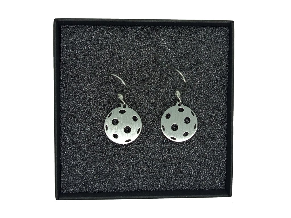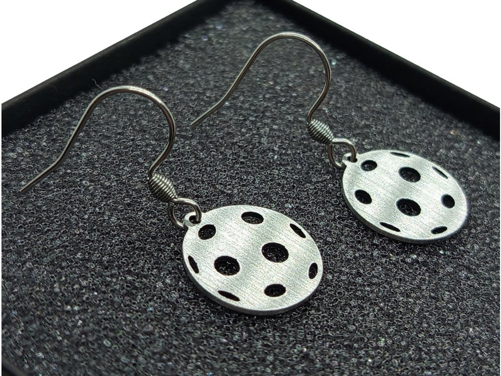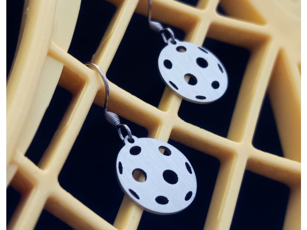 Náušnice ve tvaru florbalových míčků. Zavěšeny na afroháčcích.